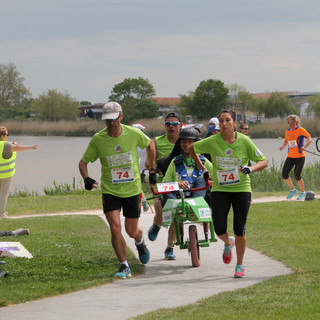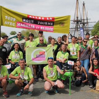 Cette année, nous sommes 97 équipages à se disputer les différents prix de ce challenge et nous nous retrouvons au milieu de belges, d’espagnols, de suisses bref la fête va être belle ! Même règlement que l’an passé, 4 pousseurs par Myolib à 1 roue pour une distance de 11km. Nous avons donc décidé une fois de plus de faire une Myolib qui jouerait le titre et une seconde qui jouerait le chrono ! Ce défi a été proposé à Vincent, Marina, Thierry et Jean pour l’équipe 1 de Magalie et à Serge, Brice, Elsa et Etche pour l’équipe 2 d’Elodie. Le briefing de début de course annonce la couleur : le parcours se compose d’une double boucle de 5,5 km qui sillonne la ville de Rochefort tantôt dans les parcs, sur les pavés en pleine ville ou bien encore sur les berges de la Charente. Les filles chaussent leurs casques, les coureurs sont échauffés, cette année nos 2 équipes partent ensemble en 18eme position, ça y est nous sommes prêts !